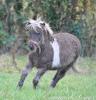 Il a hérité de la jolie teinte silver de son père et du tobiano de sa mère. JOLI ZEUS est donc précieux par la rareté de sa robe en Shetland plein papier.