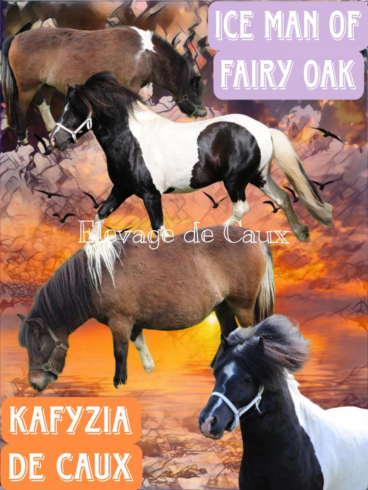 Robes possibles : pie noir (50%) ou pie bai (50%), homozygote pie à 50% et/ou homozygote noir à 50%