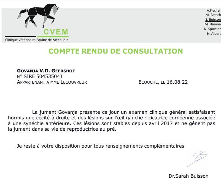 C'est peut être parce que GOVANJA est borgne de l'oeil droit et que la vue de son oeil gauche est incomplète (examen et certificat vétérinaire réalisés le 16 août 2022). La ponette est suivie par notre vétérinaire ophtalmologiste depuis son accident en 2017. Tout est stable et aucun soin n'est réalisé depuis 5 ans. Elle porte un masque anti mouche toute l'année pour préserver l'oeil gauche de tout nouvel accident éventuel. Elle mène une vie parfaitement normale au sein de notre élevage et il est impossible de deviner qu'elle est borgne.